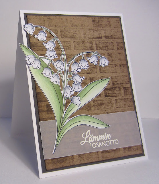 ...and as last week, I went with the bricks again. :) I used the same stencil too but this week I used it as an embossing folder in my Cuttlebug. Worked pretty well! I added some ink to the embossed panel, partly swiping with the ink pad (love the stripes that technique gives) and partly inking with a blending tool. After I had the bg ready I didn't know what to do... So I did what I so often do and colored in a simple flower image. :) This one is from PTI and has a really calm, soothing feel I think... So this became a condolences card with a Finnish sympathy sentiment heat embossed on vellum.
