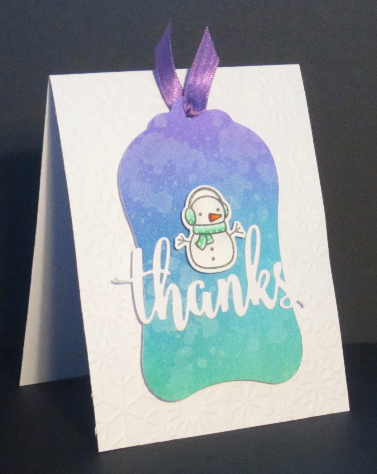ReplyDeleteSo very pretty. Love the shape of your tag, and your amazing background coloring. The mini snowman is pretty darn cute, too.