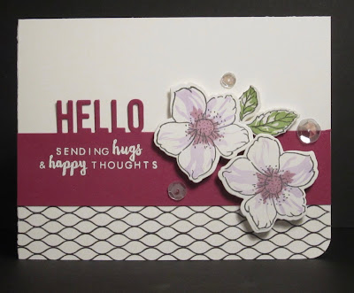 Oh such a lot of fun to see how we made these cards from the same elements. I love his you used the border stamp for the first card, great idea and I admire how you placed the leaf. I played around with all the leaves and just couldn't get them to work-I need a lesson! I see we both went with the same panel idea with the 'hello' setmimemt and nearly got the same placement of the flowers-I have used these on one of my other cards. Love the clear sequins. I often forget to use these. 2 stunning cards, can't wait to see your other ones. This was such a fun set, thanks hon x