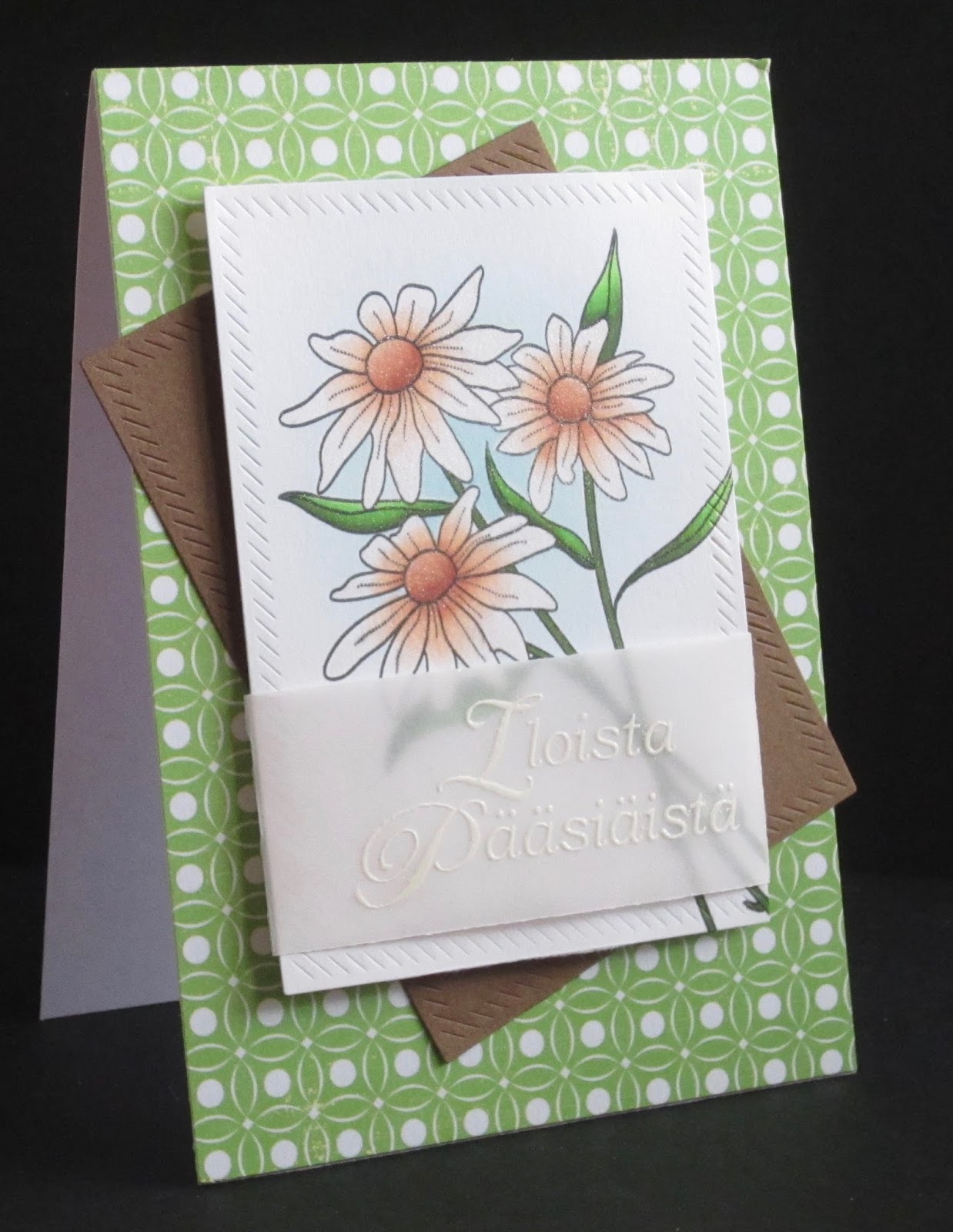 This gives you a lot of options... Perfect opportunity to begin making Christmas cards for example! I love holidays by water -both seaside holidays and summer vacations at cabins by lakes are my favorites- so I chose a water-themed starfish stamp and sunshiney sentiment for my card. Starfish stamp by Stampers Anonymous, sentiment by PTI and dies by STAMPlorations. I also used some yellow tinted Nuvo Jewel drops for embellishment -if you click the photo larger you'll see them better. This is a very simple card but I love the detail from the die cut rectangles and I think the "whiteness" of the card does keep the overall look pretty CAS. I colored my starfish with copics and added white gel pen for details.
